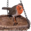Intricately detailed resin hanging feeder for birds. Hung on 3 chains it has a heart shaped rattan effect dish and perched on its side is a truly realistic robin.